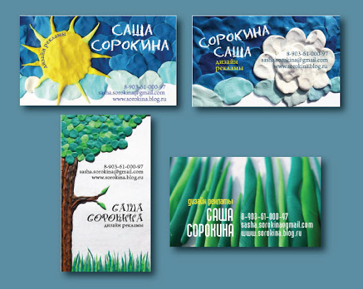 Это серия "пластилиновых" визиток. Картинки на самом деле слеплены из пластилина и сфотографированы